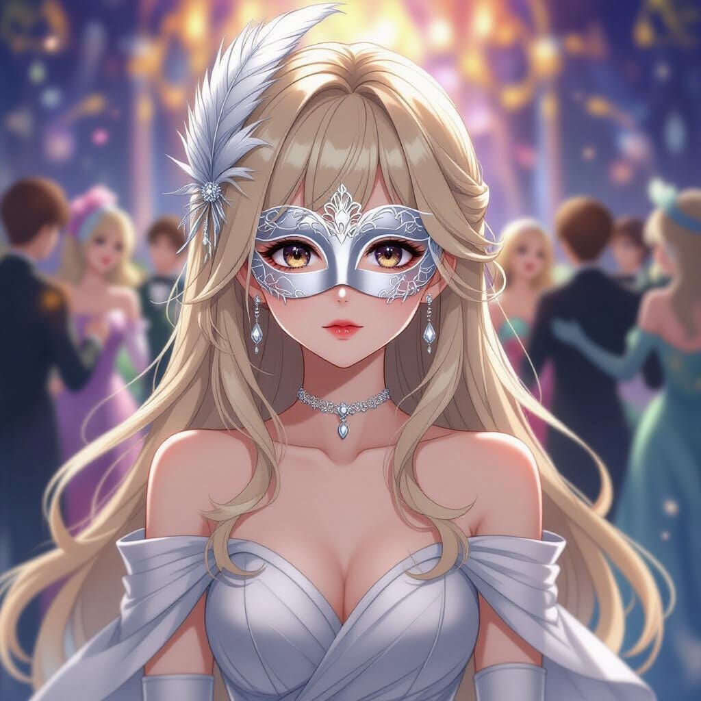 This image shows an anime girl with long silver hair wearing an elegant silver gown and a fancy mask, with a silver feather accent. Her eyes reveal deep sorrow amidst a vibrant party scene.