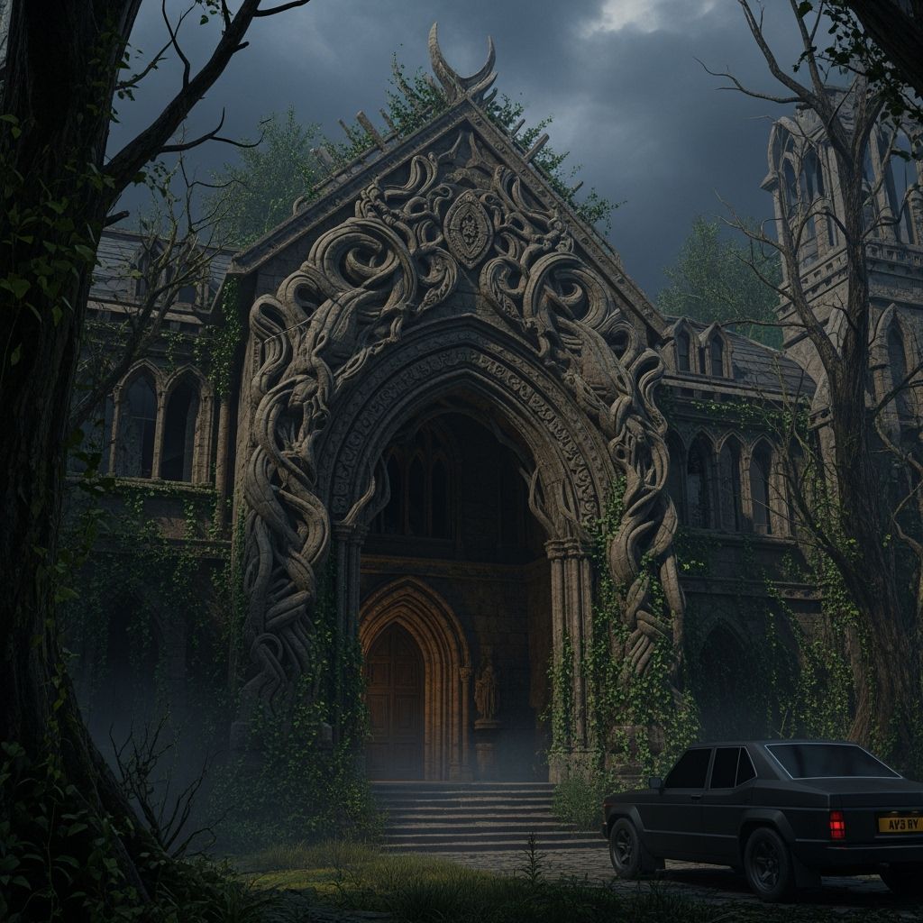 A striking picture of a grand old mansion in Texas, featuring an impressive archway and lush surroundings. A black SUV is parked outside this mysterious estate, rendered with digital art techniques.