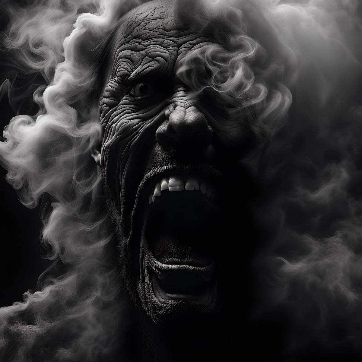 A striking picture of a screaming mouth emerging from a cloud of dark wood smoke. The image is rendered in grayscale with dramatic lighting, creating a dark, realistic effect at 8k resolution.