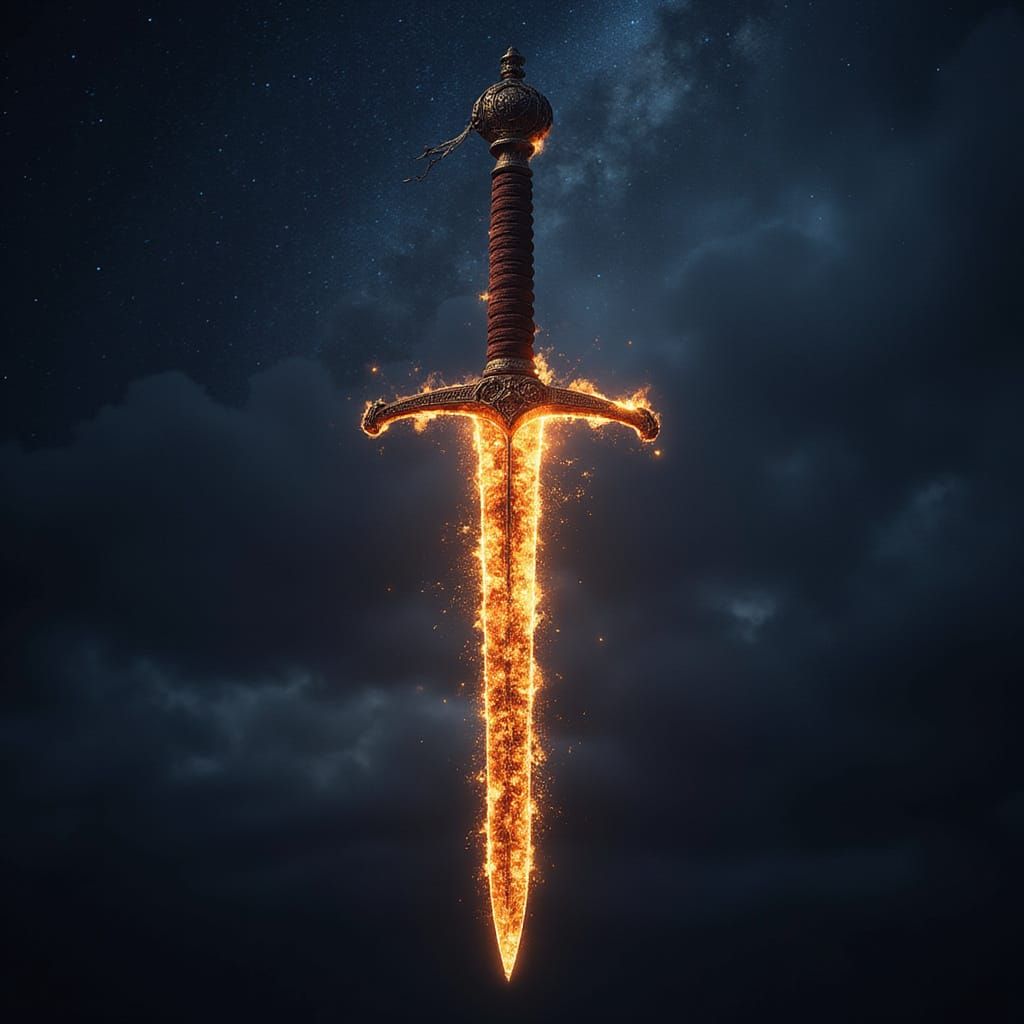 This image shows a sword seemingly made from fire and starlight set against a dark night sky. The high contrast and beautiful design give it a righteous and epic feel.
