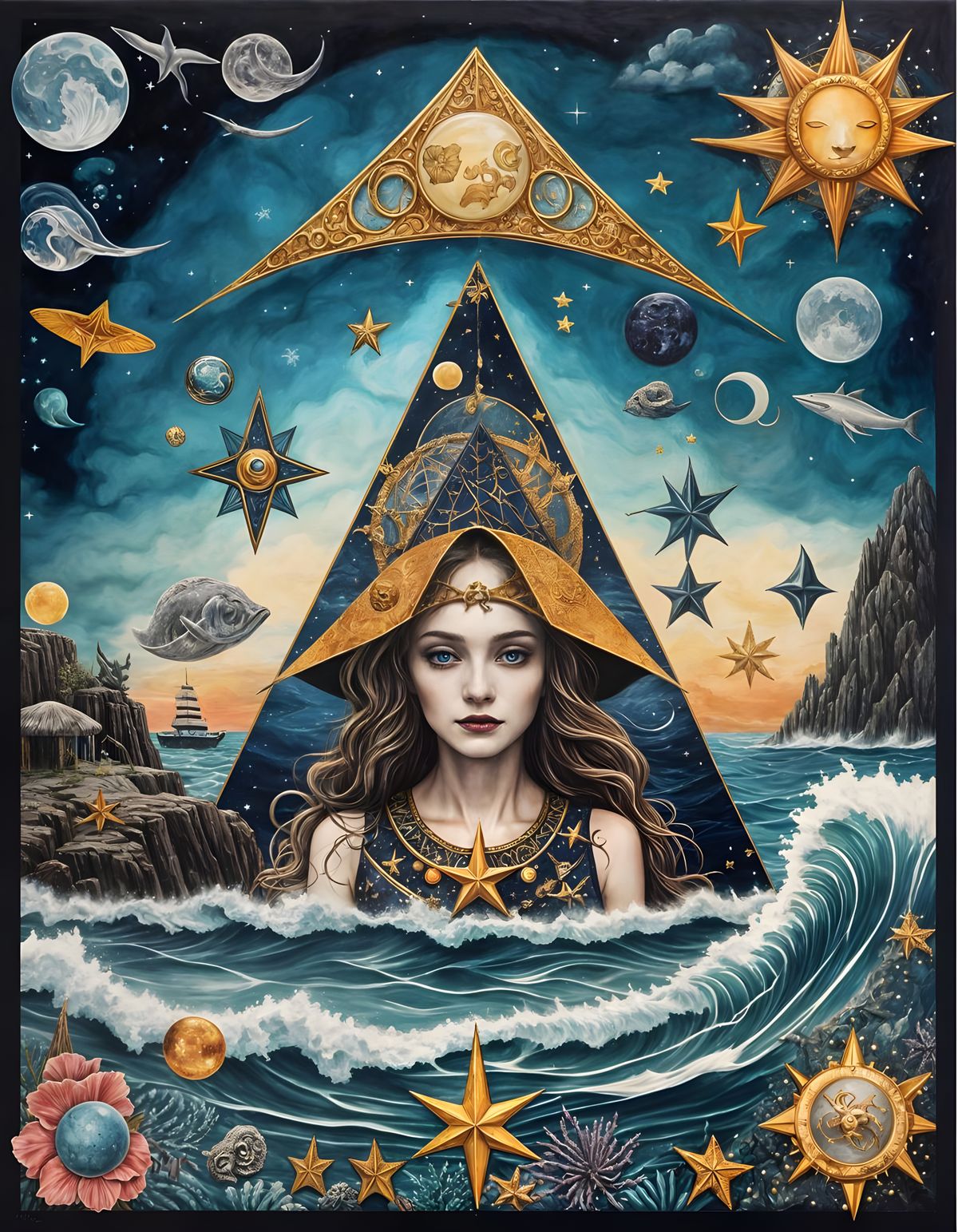 This image shows a surreal, celestial-themed design with witchy ocean elements. The artwork features a unique stationery border.