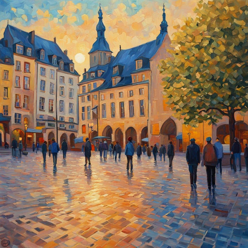 This image shows Luxembourg city square in a medium shot, rendered as an expressionist impasto oil painting. The vivid colors and geometric shapes are illuminated by golden hour lighting.