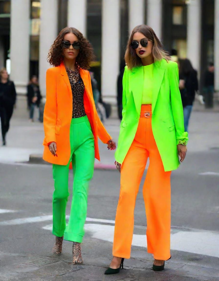 This image shows vibrant, eye-catching fashions in neon green and orange. The striking color palette and modern designs create a bold and energetic visual statement.