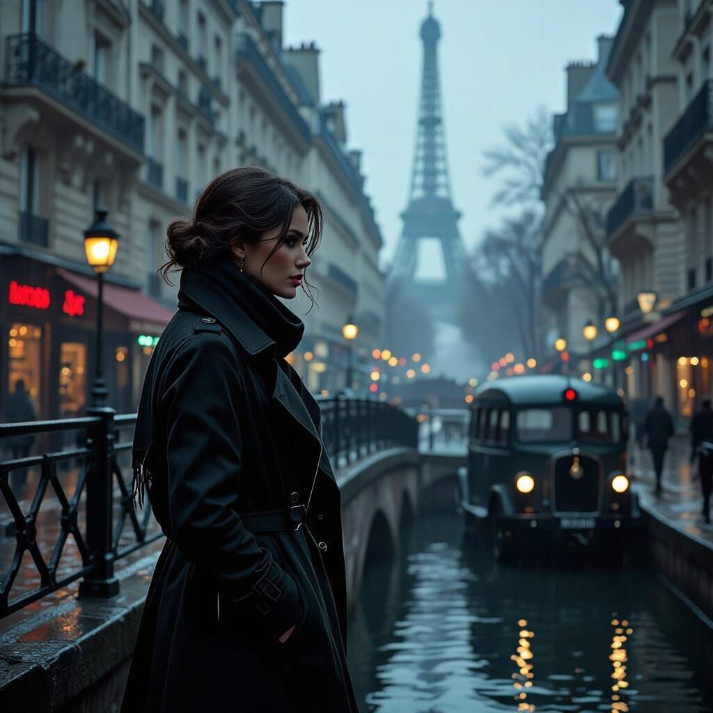 This image shows a lone woman spy walking across a bridge in 1942 Paris. The scene features cinematic noir lighting, rain, and a desaturated teal, brass, and ink-black color palette. The artwork is reminiscent of film noir.