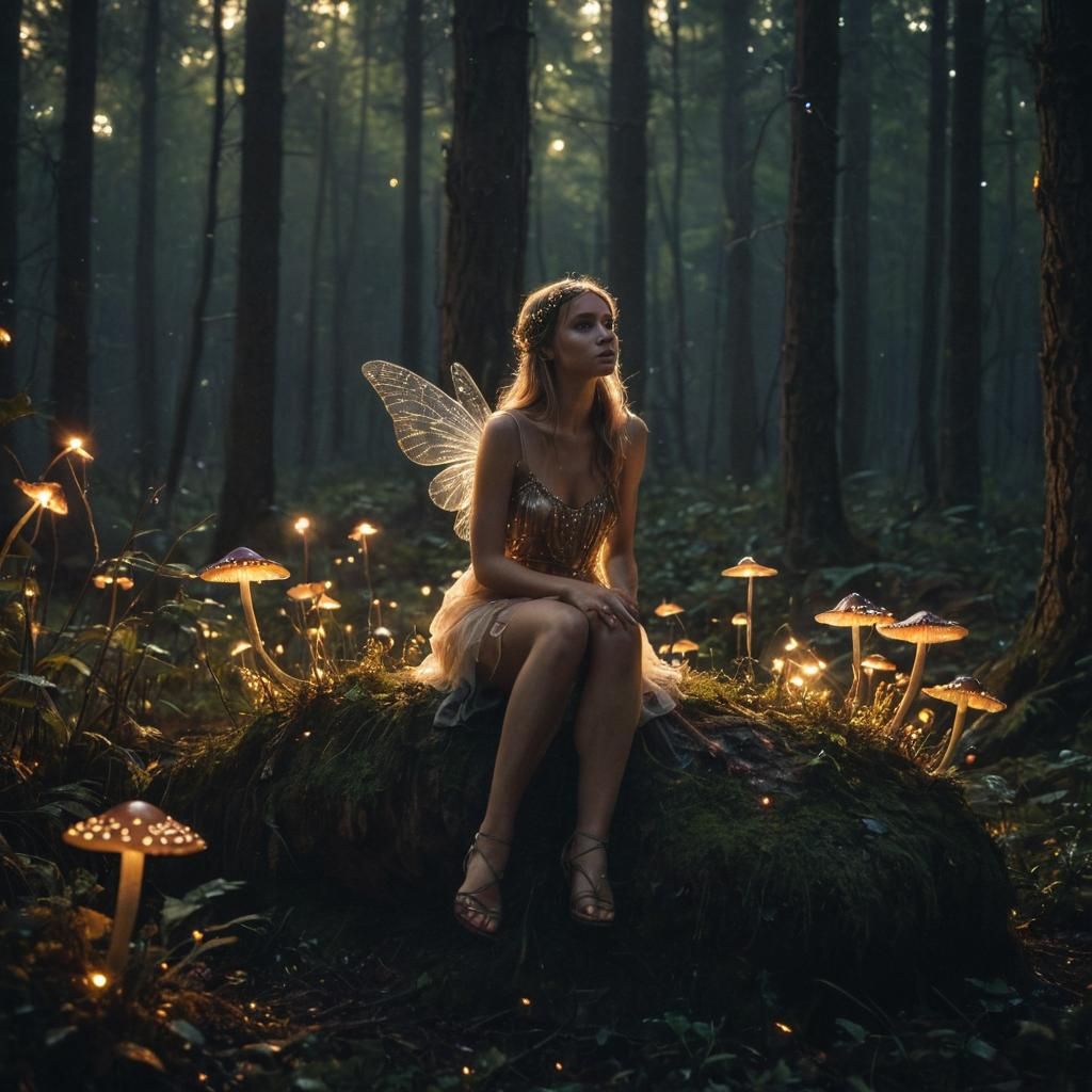 A magical fairy rests on a mushroom in an enchanted forest. Fireflies glow in the moonlight, illuminating the cinematic scene with warm, triadic colors. This image shows surreal light art.