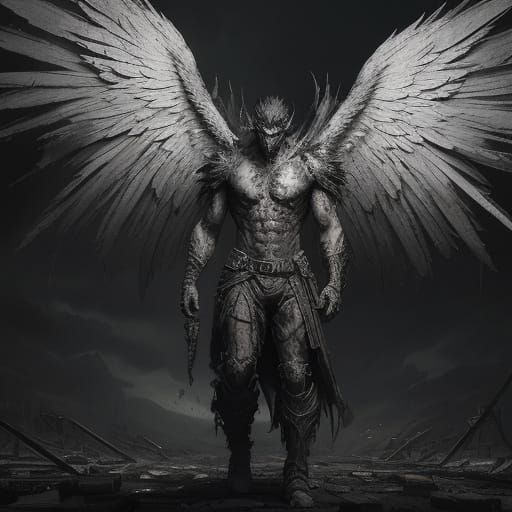 A striking picture of a dieselpunk fallen angel in a ruined city. The angel has silver skin with glowing cracks, tattered wings, and a broken halo. The image features dark tones and dynamic lighting.