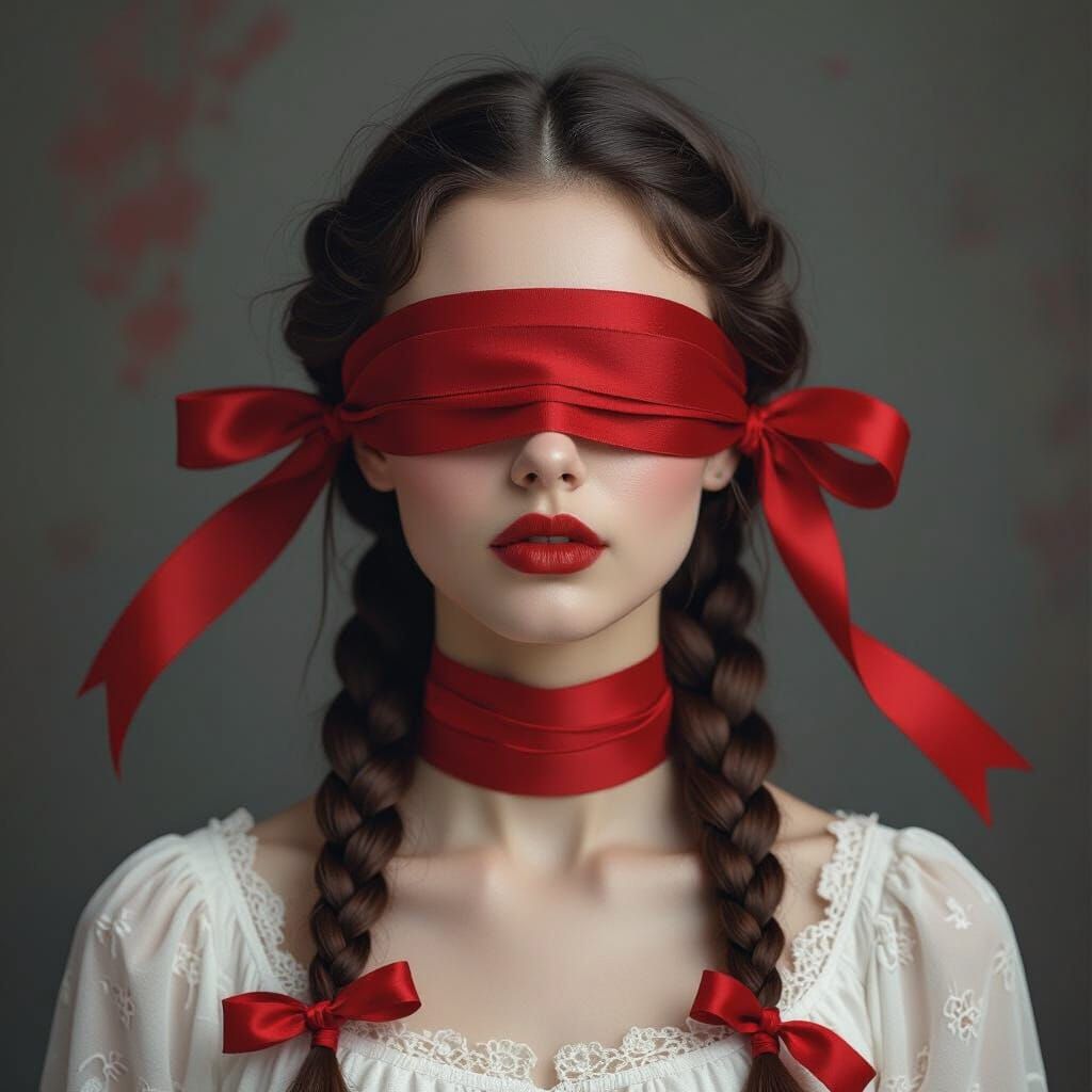 This image shows a blindfolded woman with braided hair and red ribbons, against a dark backdrop. The artwork uses double exposure with blurred watercolor and crayon textures, in a fantastical and ethereal style.