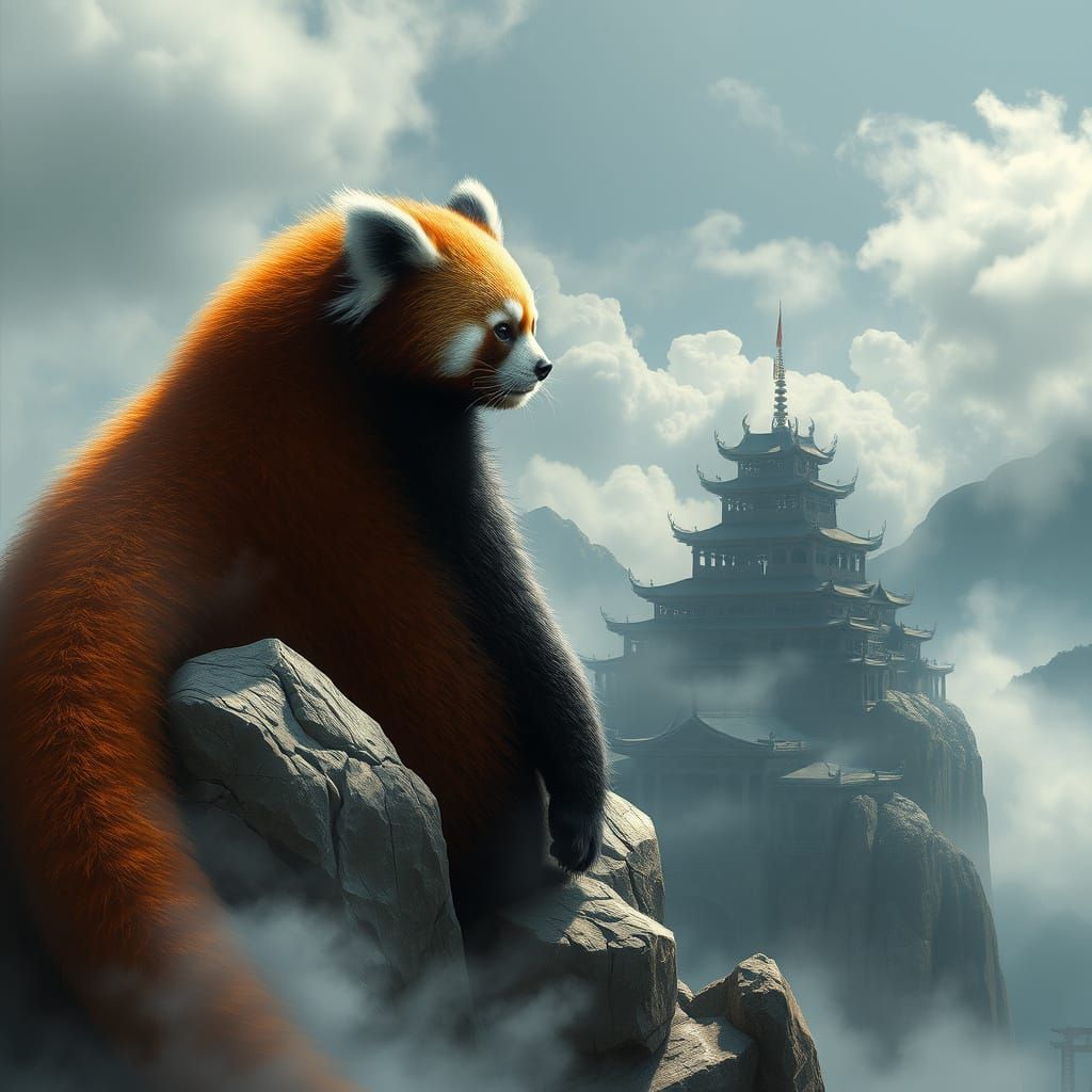 This image showcases a red panda as a mystical guardian spirit at a mountain temple, blending with stone and mist. It overlooks a cloudy valley, rendered in epic fantasy concept art style.