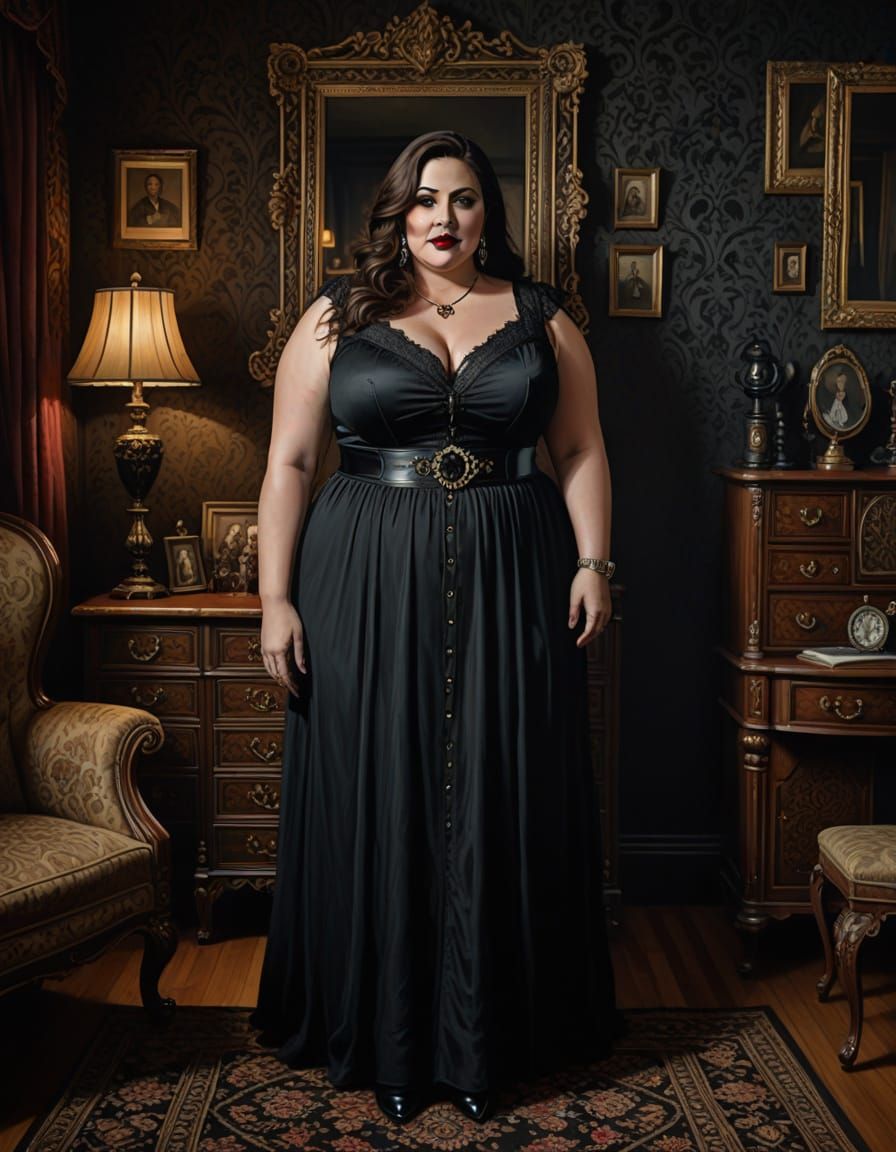 This image shows a curvy, plus-size Arabian woman in a gothic Victorian dress, standing in an old guestroom. The portrait is rendered in a retro watercolor style with dark tones, showcasing intricate details.