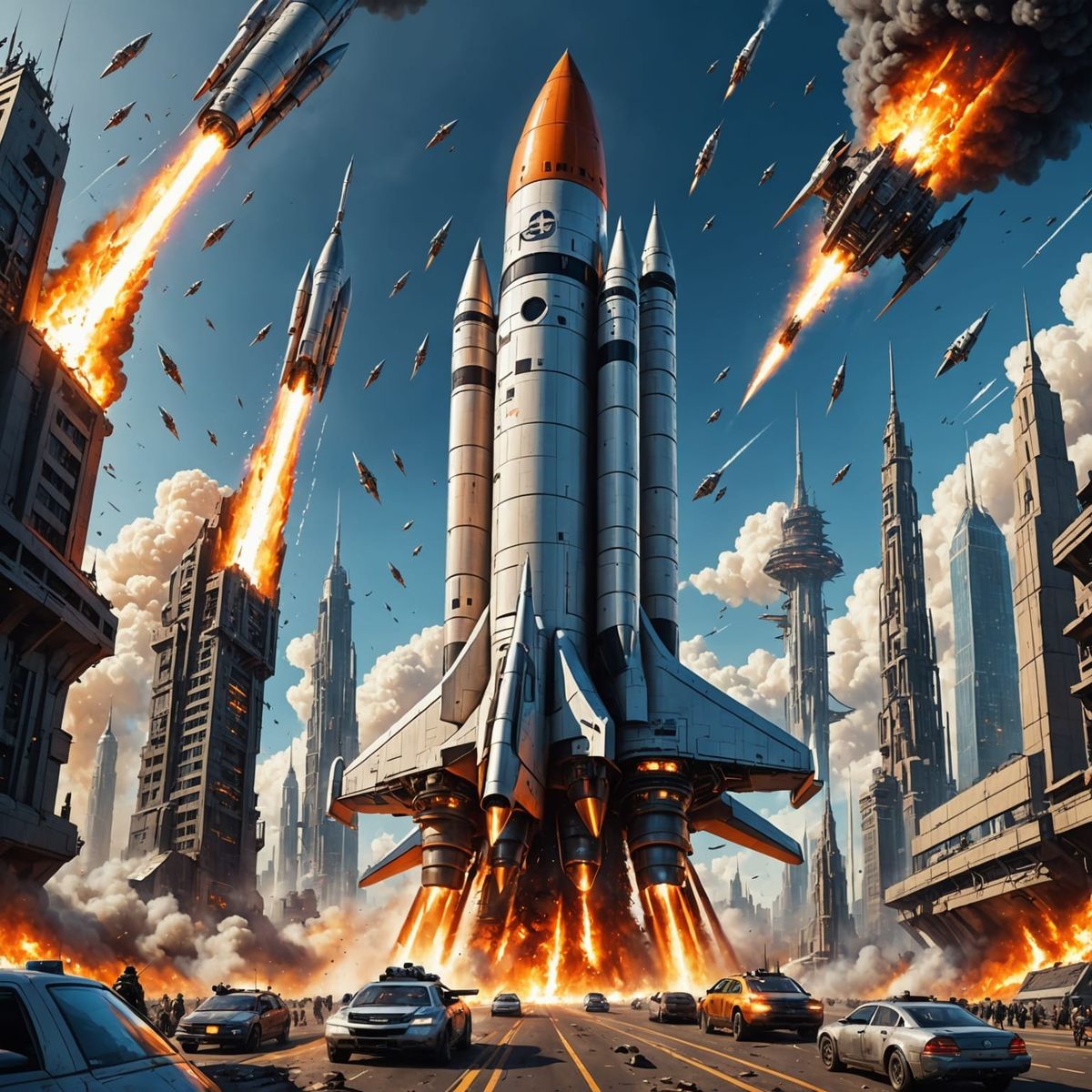 This image shows a futuristic rocket launching from a sprawling spaceport city. The scene is filled with neon lights and advanced technology, rendered with hyper-realistic detail and dramatic lighting.