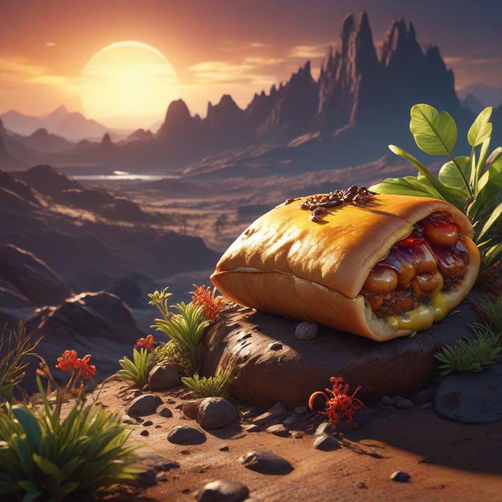 This image shows a golden, crispy chimichanga on a vibrant alien world with bioluminescent plants. Created as detailed fantasy concept art with saturated colors.