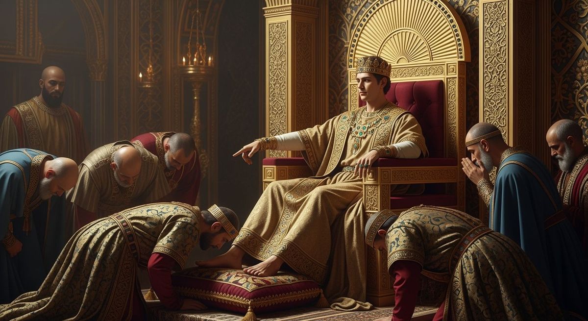 This image shows a young Byzantine emperor on a golden throne, attended by kneeling counts in an opulent palace. The scene is richly detailed, illuminated with natural light, and captured in ultra-high resolution.