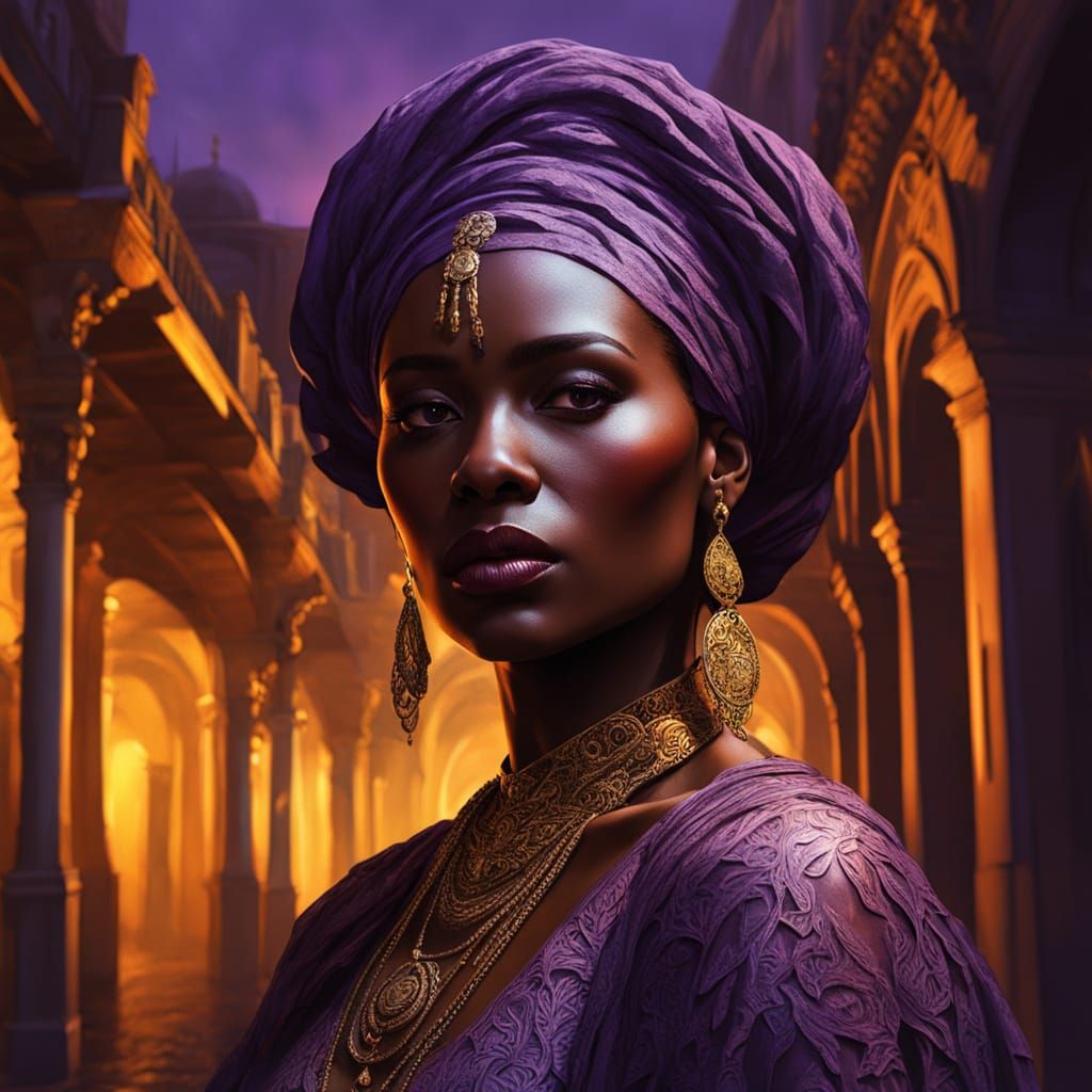 This image shows a dark-skinned woman in Santa Cruz de Triana, adorned with intricate purple lace and golden jewelry. The scene is illuminated by dynamic purple and yellow lighting, rendered in a dark fantasy aesthetic.