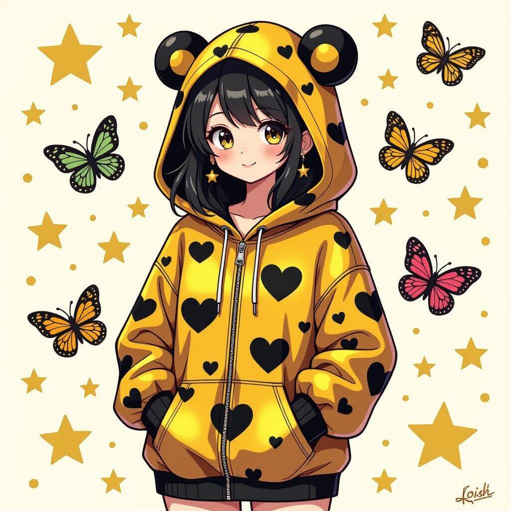 This image features Nova wearing a striking gold and black hoodie adorned with heart, star, and butterfly patterns, rendered in a bold, contrasting color style.