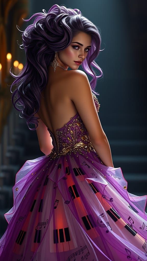 . A captivating model dons a unique evening gown made of piano keys, with her hair intricately styled to resemble musical notation. The ensemble is accentuated by liquid gold, onyx, and silver highlights, emanating an aura of high fashion. The striking chiaroscuro-style lighting adds depth and contrast, ...