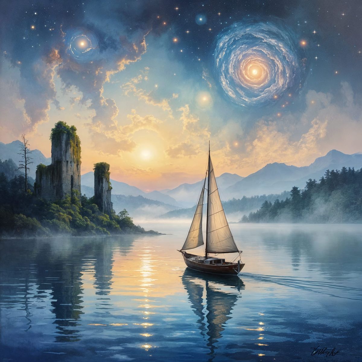 A lone sailboat drifts on a foggy lake at dawn, with ancient ruins visible through the mist. The sky displays swirling nebulae and celestial patterns, rendered in a vibrant, textured impasto painting style.