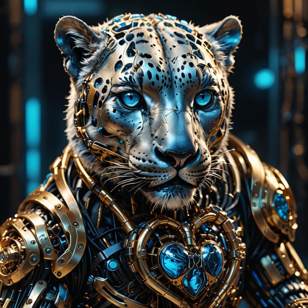 A striking picture of a snow leopard cyborg holding a black anatomical heart. The image features golden biomechanical art, glowing neon blue accents, and intricate copper wiring. The visual aesthetic is hyper-realistic sci-fi.