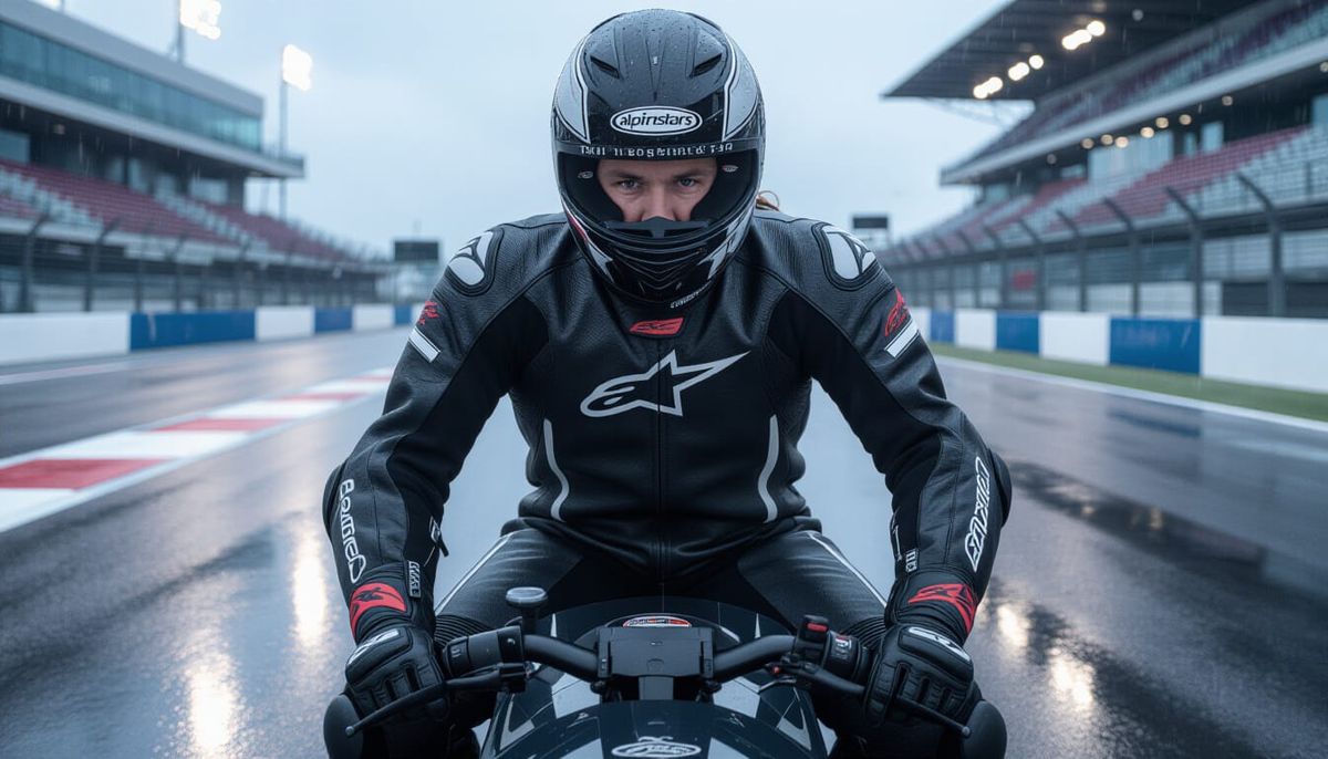 This image shows a motorcycle racer in full leathers crouched at the starting line. Rain droplets are visible on the suit, which has an aerodynamic design. It has a cinematic, high-detail aesthetic.
