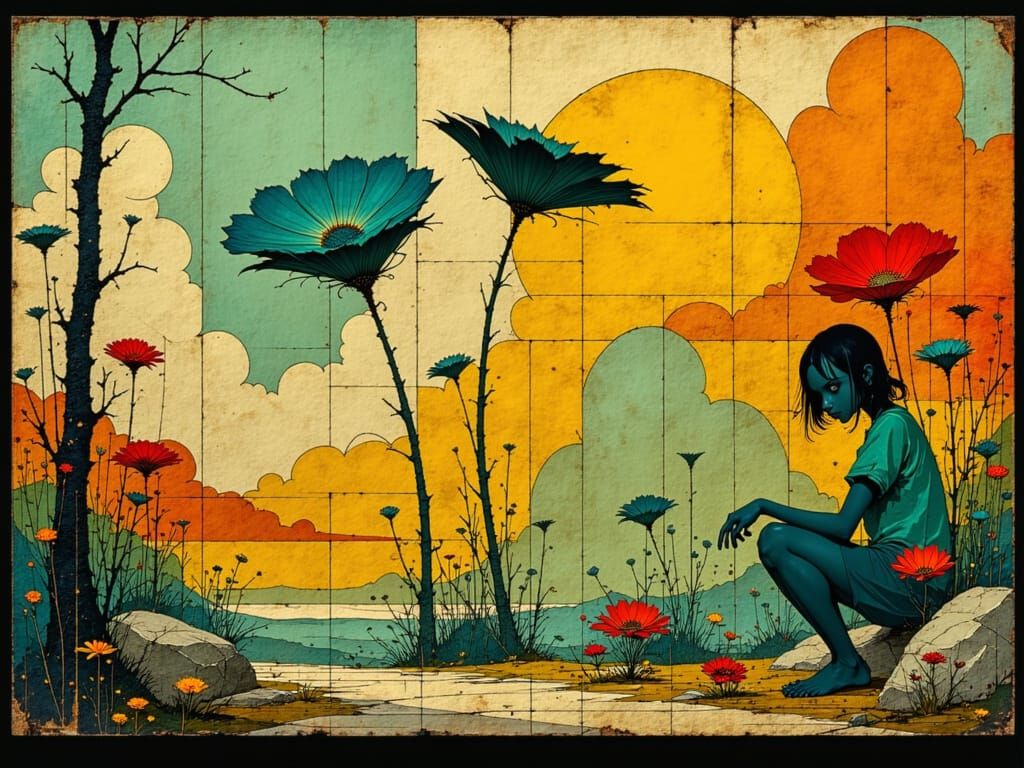 A vivid gouache painting showcases a menacing mutant plant dominating a garden. The artwork reflects an art deco aesthetic reminiscent of the Harlem Renaissance, emphasizing golden ratio principles.