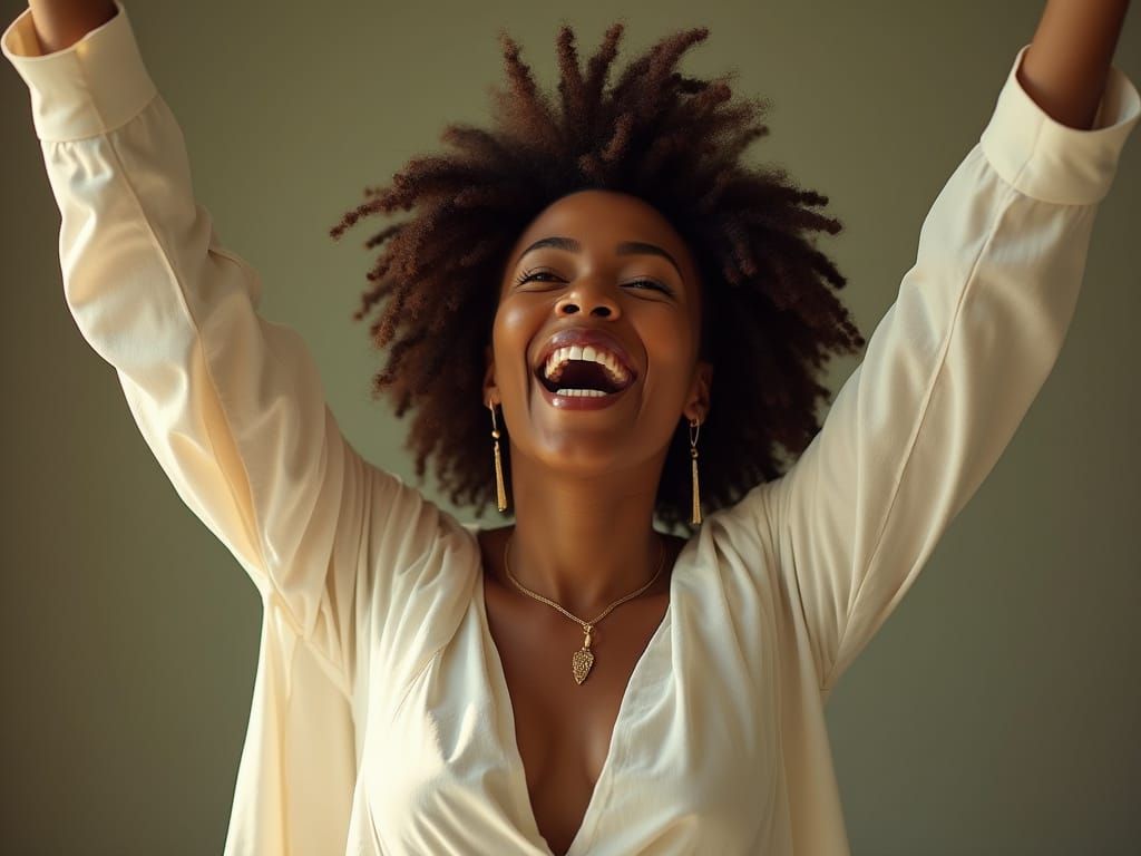 This image shows an African American woman experiencing a triumphant breakthrough. She exudes confidence, joy, and power, dressed in white attire, with natural, kinky hair, captured as a cinematic film still.