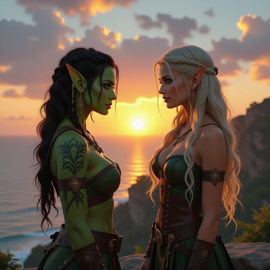 A photorealistic depiction of a green-skinned, pointy-eared half-orc woman and a blonde elf woman sharing a moment on a cliffside as the sun sets.