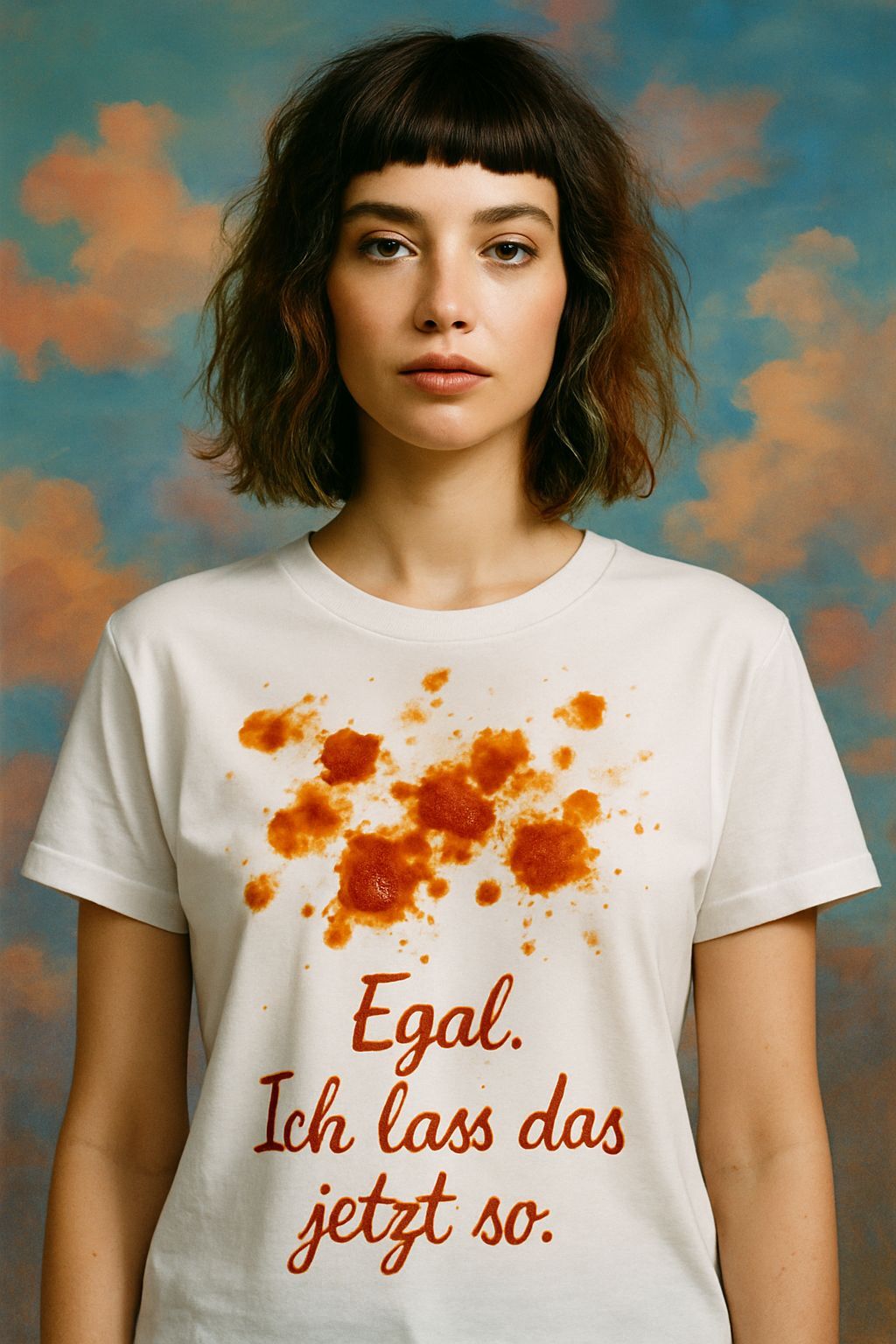 If you tend to make a mess and spill tomato sauce, this is the fashion for you! The caption on the shirt translates as "Never mind. I'll leave it like that now." 🤭😅
