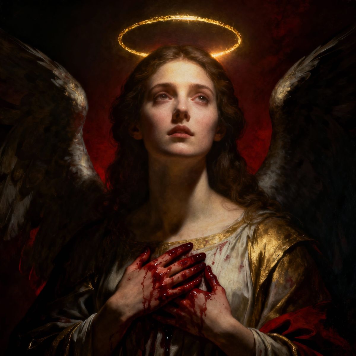 This image depicts an angelic figure with a serene expression, a golden halo, and blood on her hands, rendered in a dark, cinematic fantasy style with dramatic lighting.
