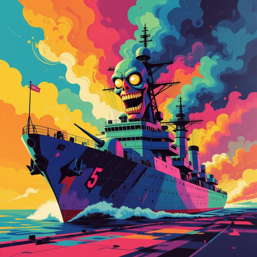A vibrant and dynamic image of a gigantic, lively destroyer with a mad expression. The artwork evokes a bio-mechanical and surreal aesthetic.