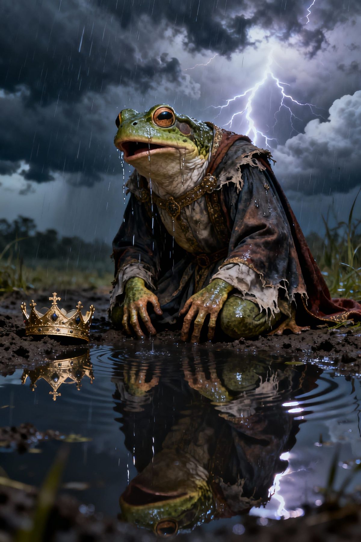 A photorealistic image of an old frog in tattered regal robes kneeling by a dark pond under a stormy sky. Lightning illuminates his reflection, emphasizing a mood of epic loneliness and despair.