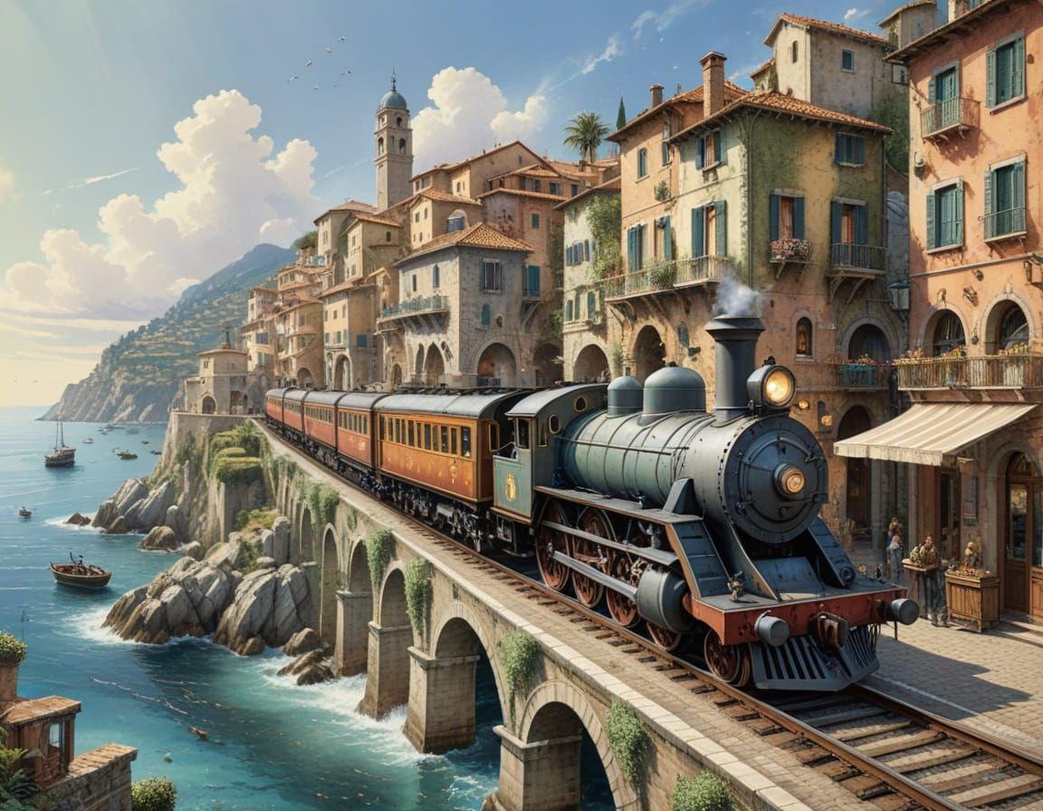 This image shows a train journey through a quaint Italian coastal town. The artwork has a steampunk vibe and is presented as a highly detailed watercolor fantasy illustration.