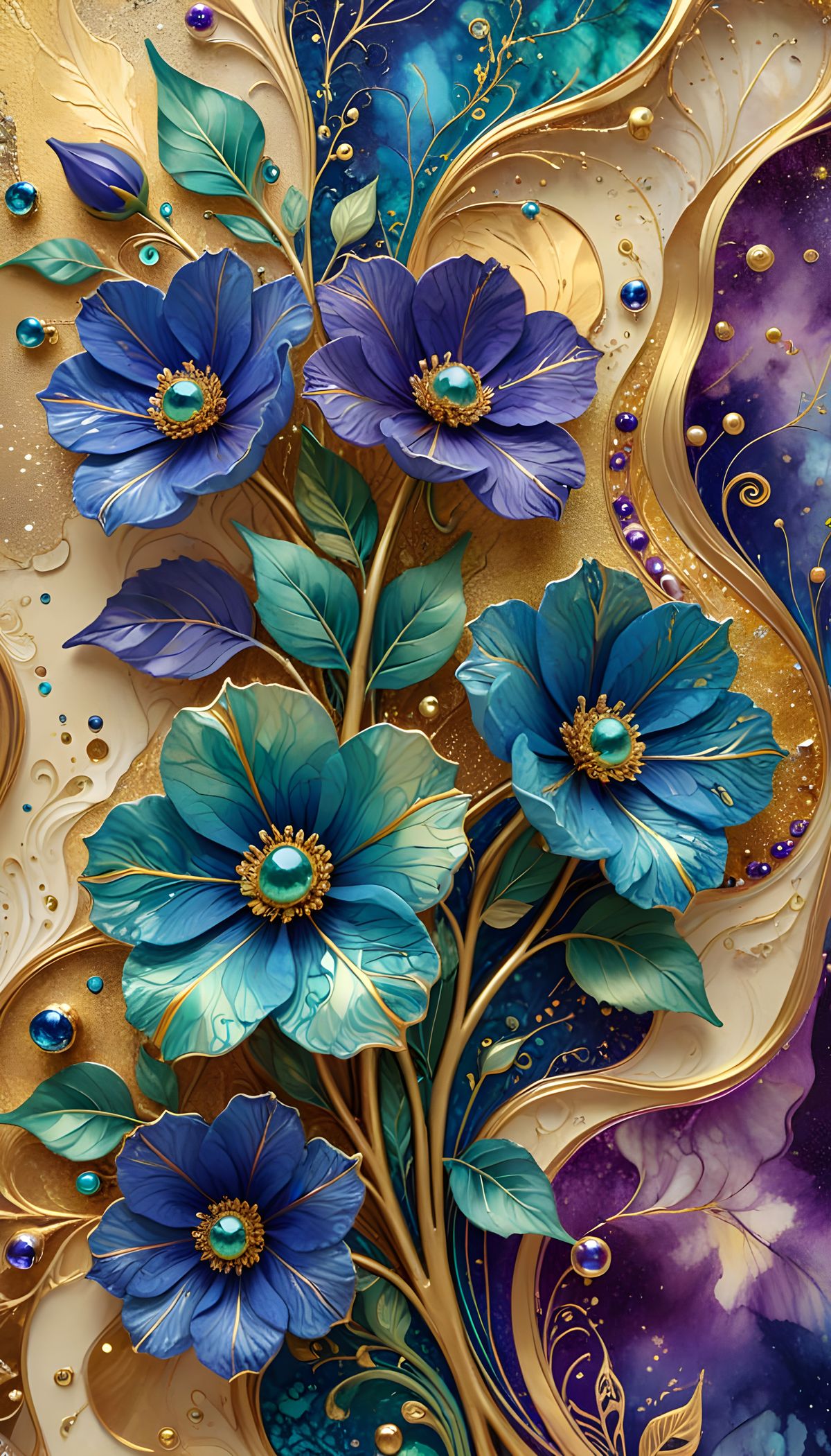 A close-up watercolor of three blue and purple flowers with gold stems. Features Zentangle patterns, gold dust outlines, and a geode background in beige and green swirls, as a vibrant abstract fractal.
