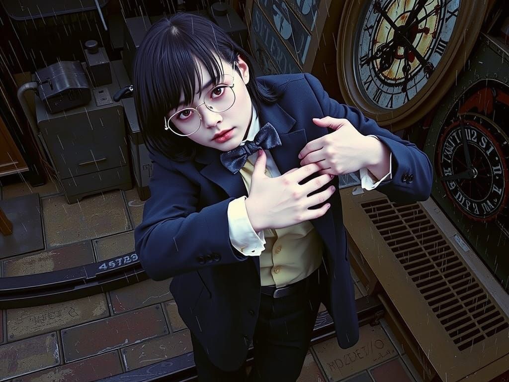 A striking black and white photograph of Nyarlathotep, a gorgeous pale woman with red eyes and black hair, embracing her husband on a clock tower in the rain. The image evokes the style of 1920s film noir.