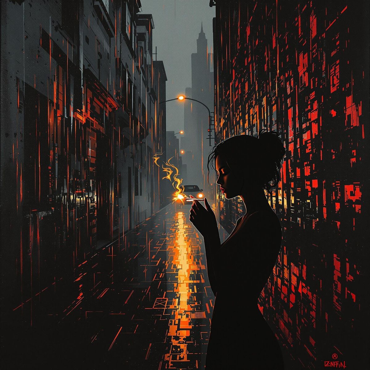 This image shows a woman in a rain-soaked alley, lit by a golden glow, her face illuminated by the flame of a lit cigarette, amidst a moody, atmospheric scene with bold brushstrokes and vibrant colors, evoking a sense of desperation and impending doom.