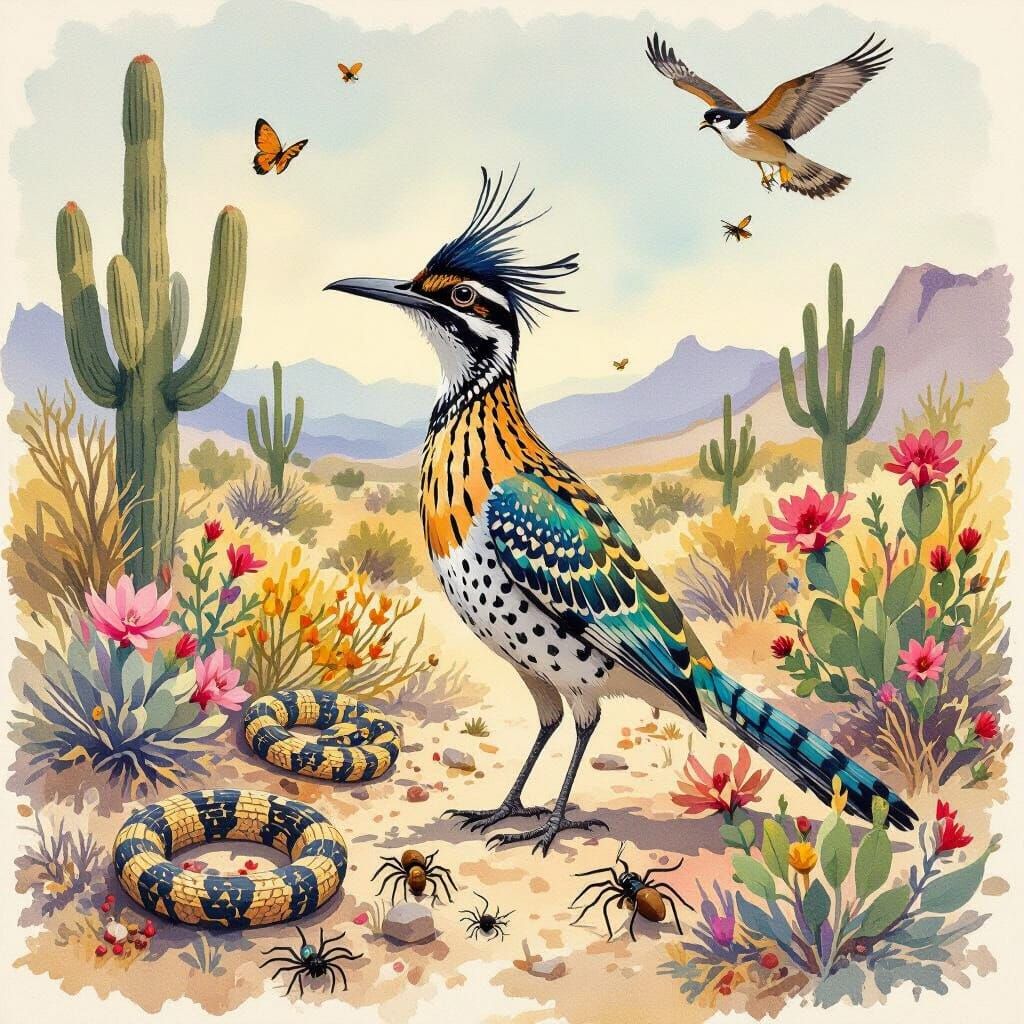 This image shows a vibrant roadrunner in a thriving desert habitat. The watercolor painting style evokes Beatrix Potter's whimsy, Edward Wesson's expressiveness, and the intricate details of Charles Rennie Mackintosh.
