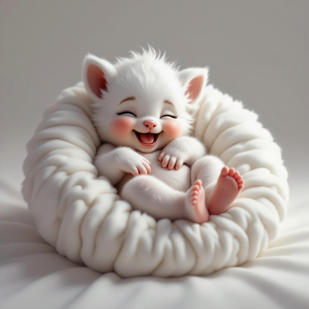 A white-silver lot in European baby lies curled up in a round ball position on a soft white background. The baby's large are bright and prominent on its furry face, which displays an open-mouthed expression showing its teeth in a laughing pose. The baby's thick, coat features detailed fur textures and ...