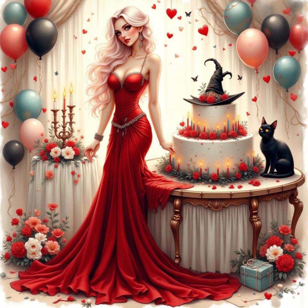 This image features a stunningly beautiful elven woman with white-pink hair in a sensual red party gown and stilettos. She stands by a witch's hat cake with a black cat, in a festive room.
