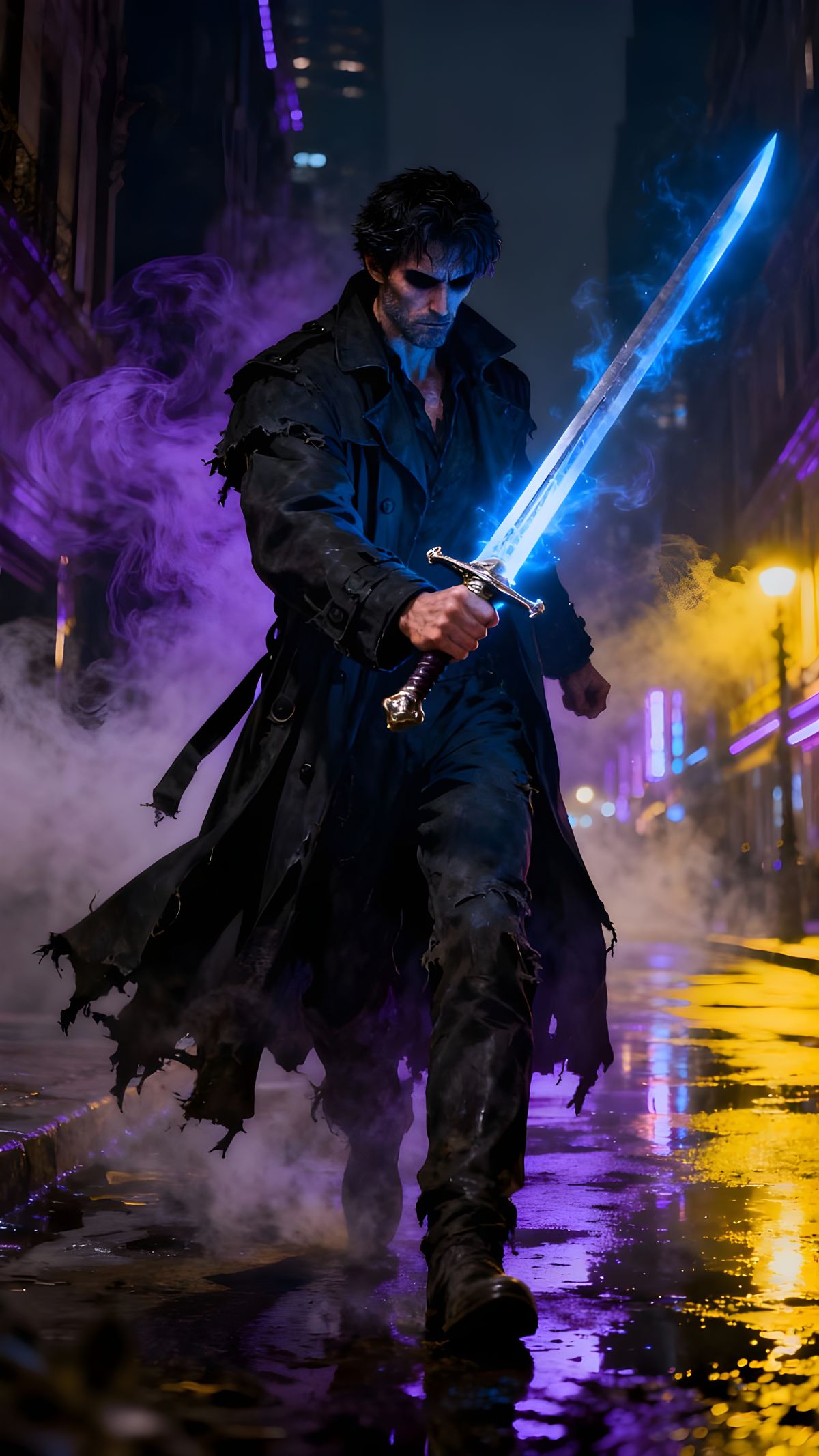 This image shows a grim man in a tattered trench coat holding a blue glowing sword. The scene is a dark, wet city street with neon reflections and mist, rendered in a hyperrealistic, cinematic style.