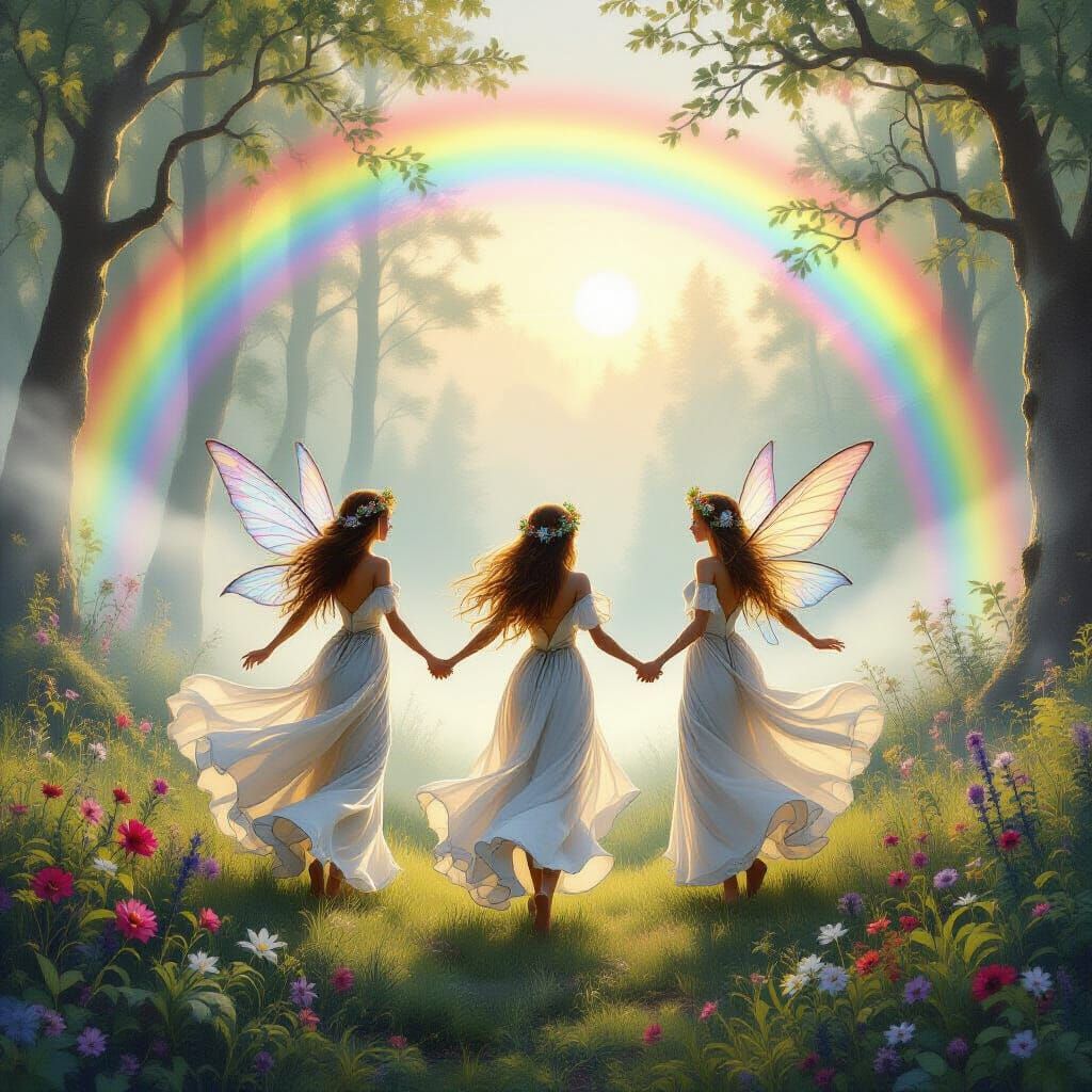 This image shows fairies dancing among rainbows in a misty forest at sunrise. The artwork blends fantasy and realism, with a whimsical style evoking classic fairy tale illustrations.