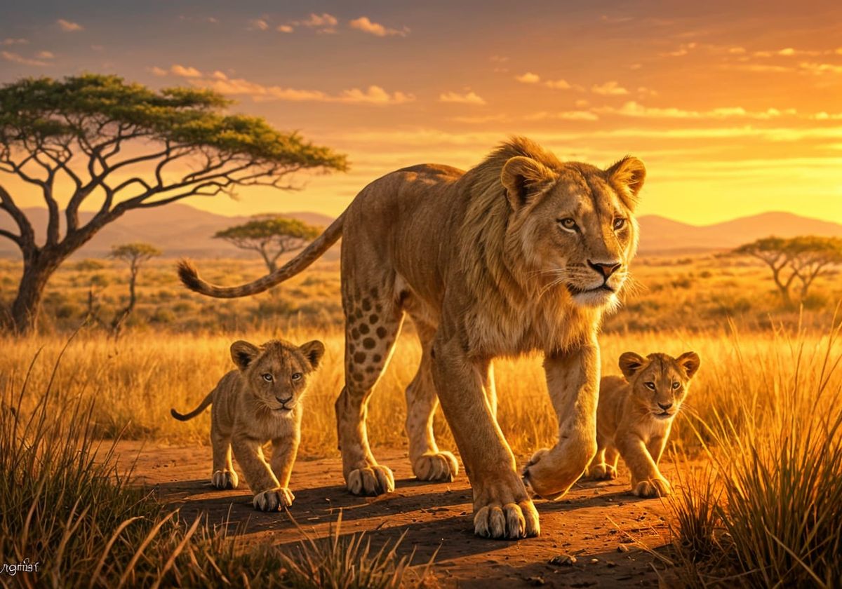This vibrant image captures a fierce lioness strolling through a lush savannah, surrounded by acacia trees and a stunning sunset. Her three playful cubs trot by her side, embodying the wild beauty of Africa's golden grasslands.