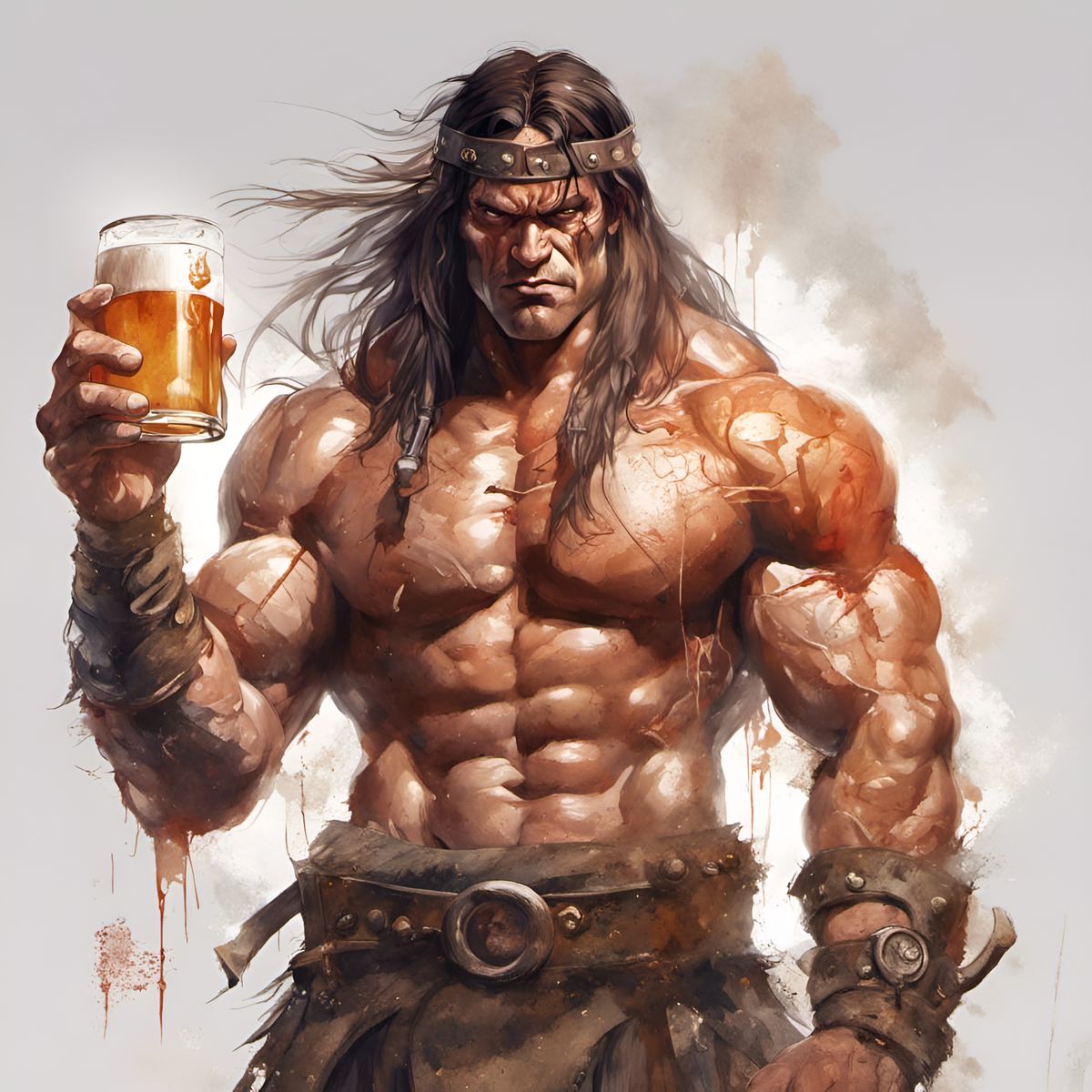 A digital illustration of a muscular barbarian flexing and holding a beer. The portrait features detailed character design and background, reminiscent of golden age illustration.