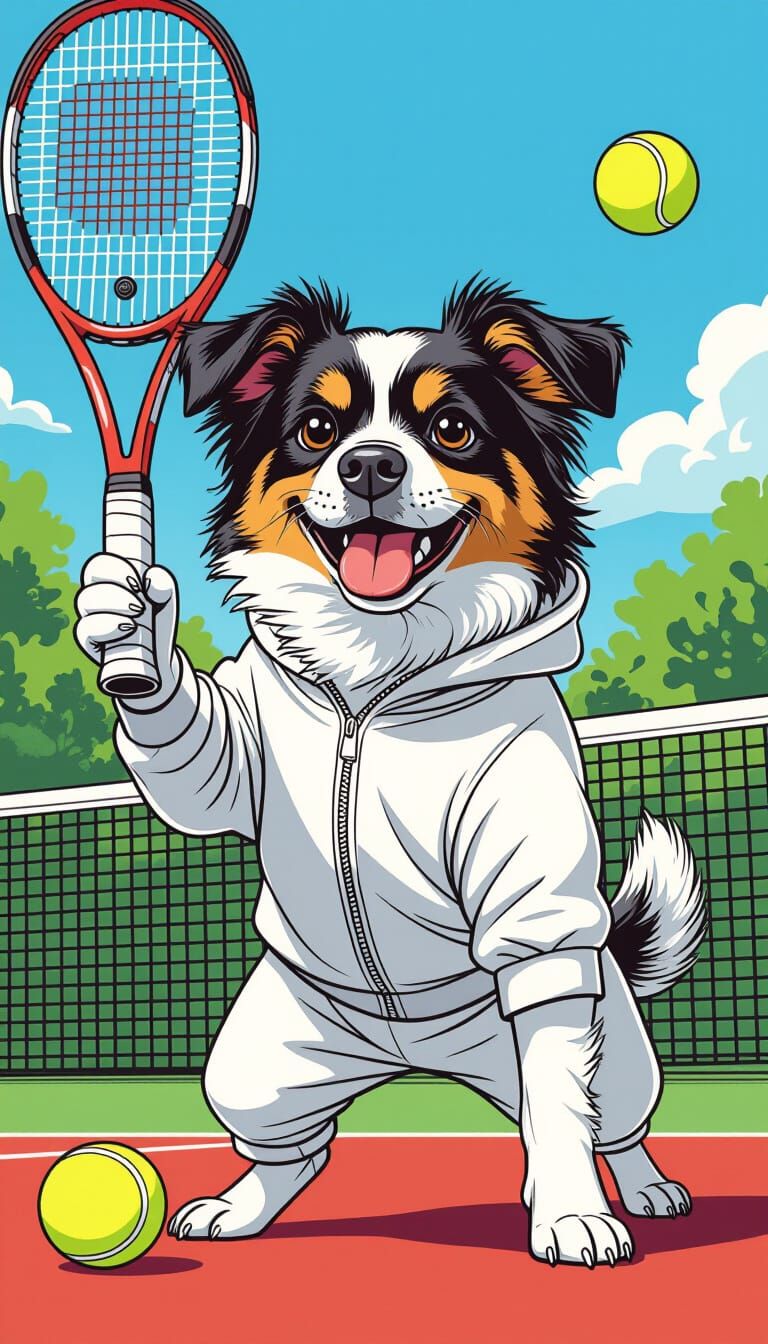 This image shows a dog in a white outfit playing tennis. The artwork has a comic art style.