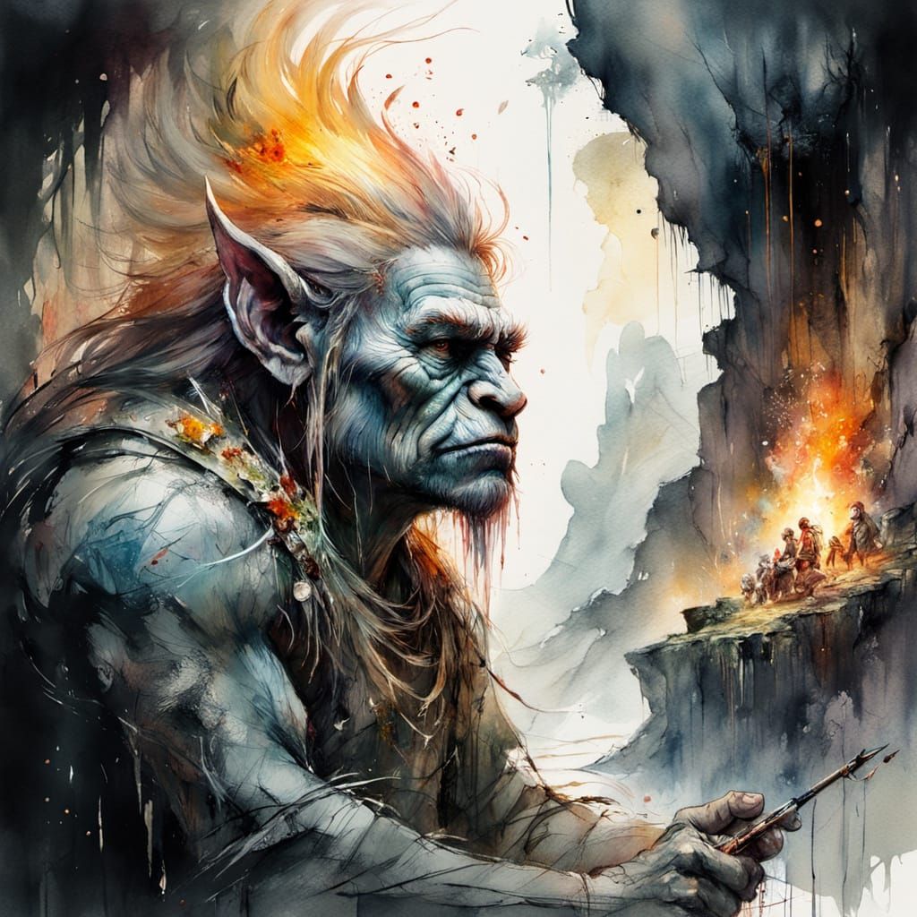 This image shows trolls guarding a cave entrance in a medium shot. It's a watercolor-style image with soft brushstrokes, vibrant colors, and warm, golden lighting, creating a dreamy, stylized fantasy scene.
