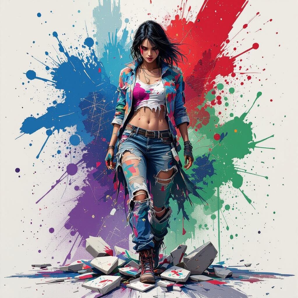 A vibrant female figure stands amid colorful splatters and ceramic shards. Her clothing is torn and paint-splattered, in a dynamic scene reminiscent of bold, abstract digital artwork.