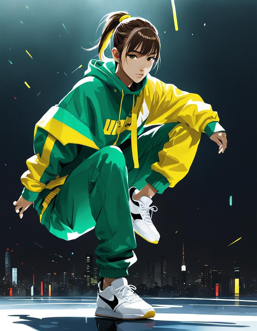 (Australian breakdancer raygun:1.6) green and yellow tracksuit; brown ponytail;ultra detailed digital illustration by (Pascal campion) ultra detailed eyes; ; triadic colors; manga masterpiece by yoji shinkawa and WLOP; anime realism