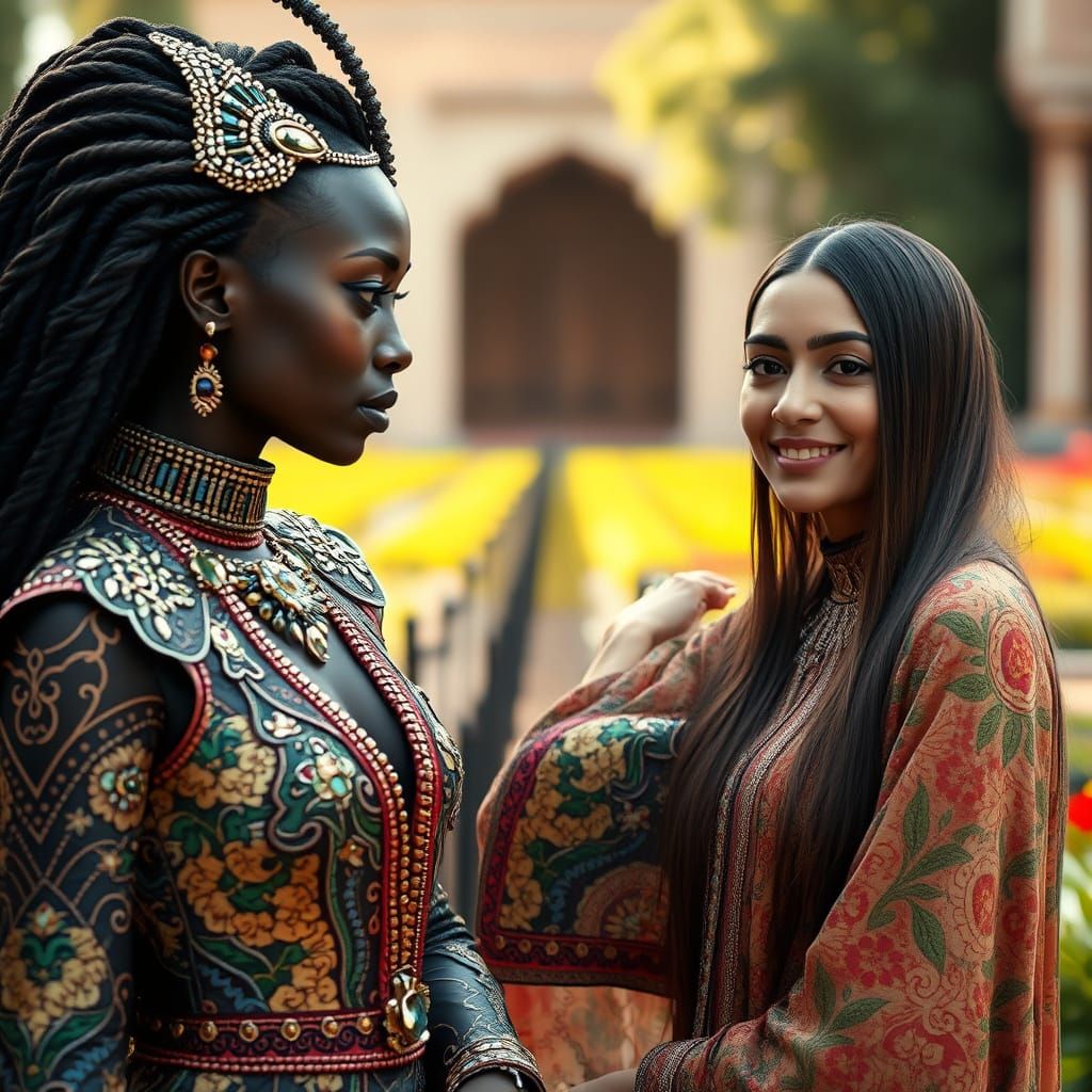 A photorealistic image shows two women in elaborate, culturally inspired attire within a lush Islamic garden. The depiction uses natural lighting and bokeh to create a magical, lifelike scene.