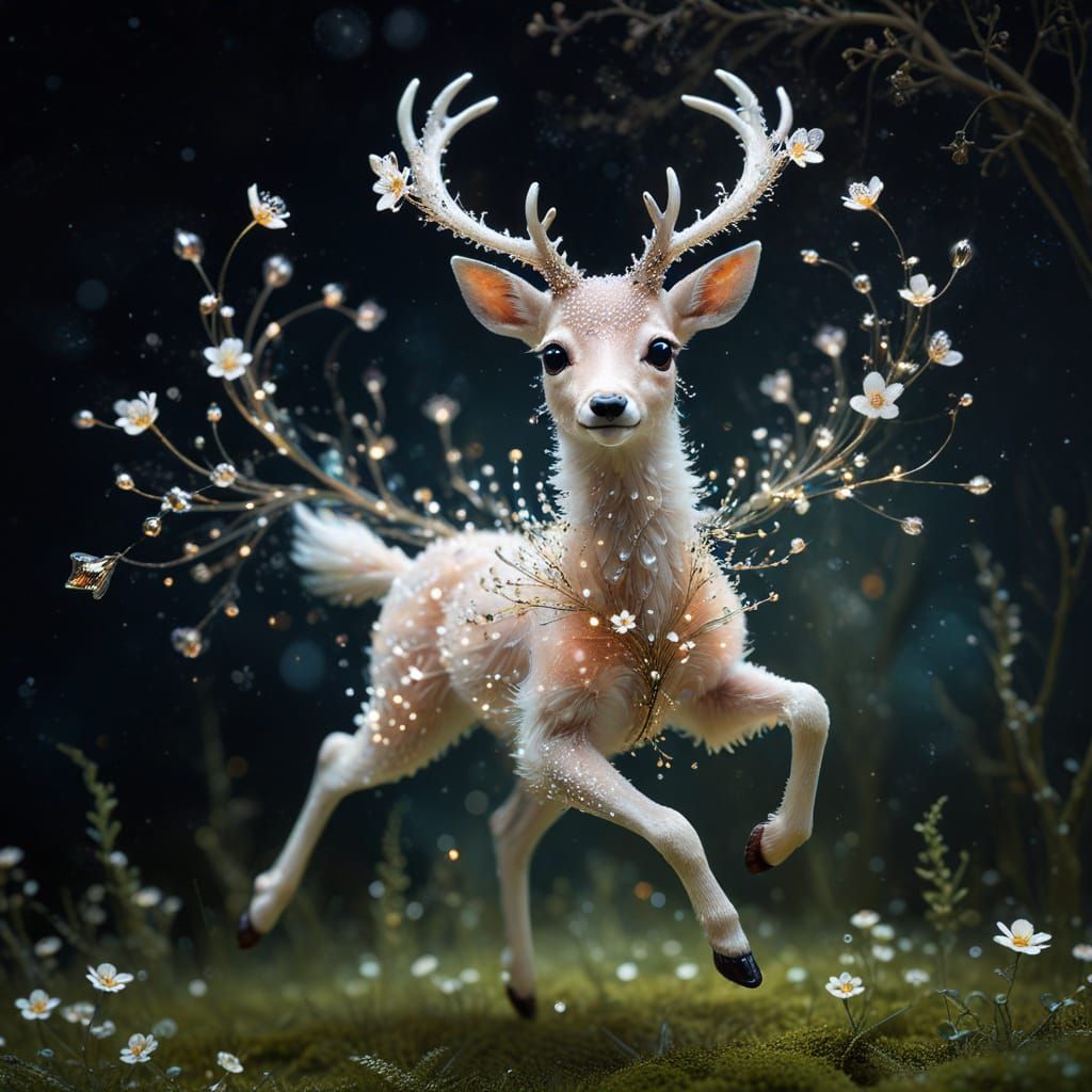 fantastical otherworldly Pretty adorable cute kind sweet stardust glass deer in mid air jump with big adorable eyes portrait Beautiful pretty By Mandy Disher, flora borsi, fantastical otherworldly, white flowers, vibrant soft fireflies, intricate infinite fractal micro synapses diamond fur, intricate ...