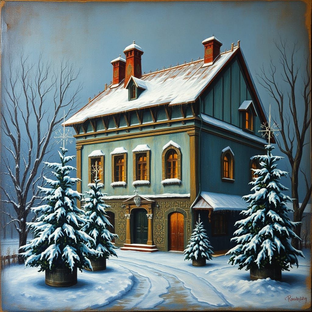 This image depicts a vintage Russian building in a winter setting, featuring frozen topiaries, presented in the style of a 1500s Tudor oil painting.