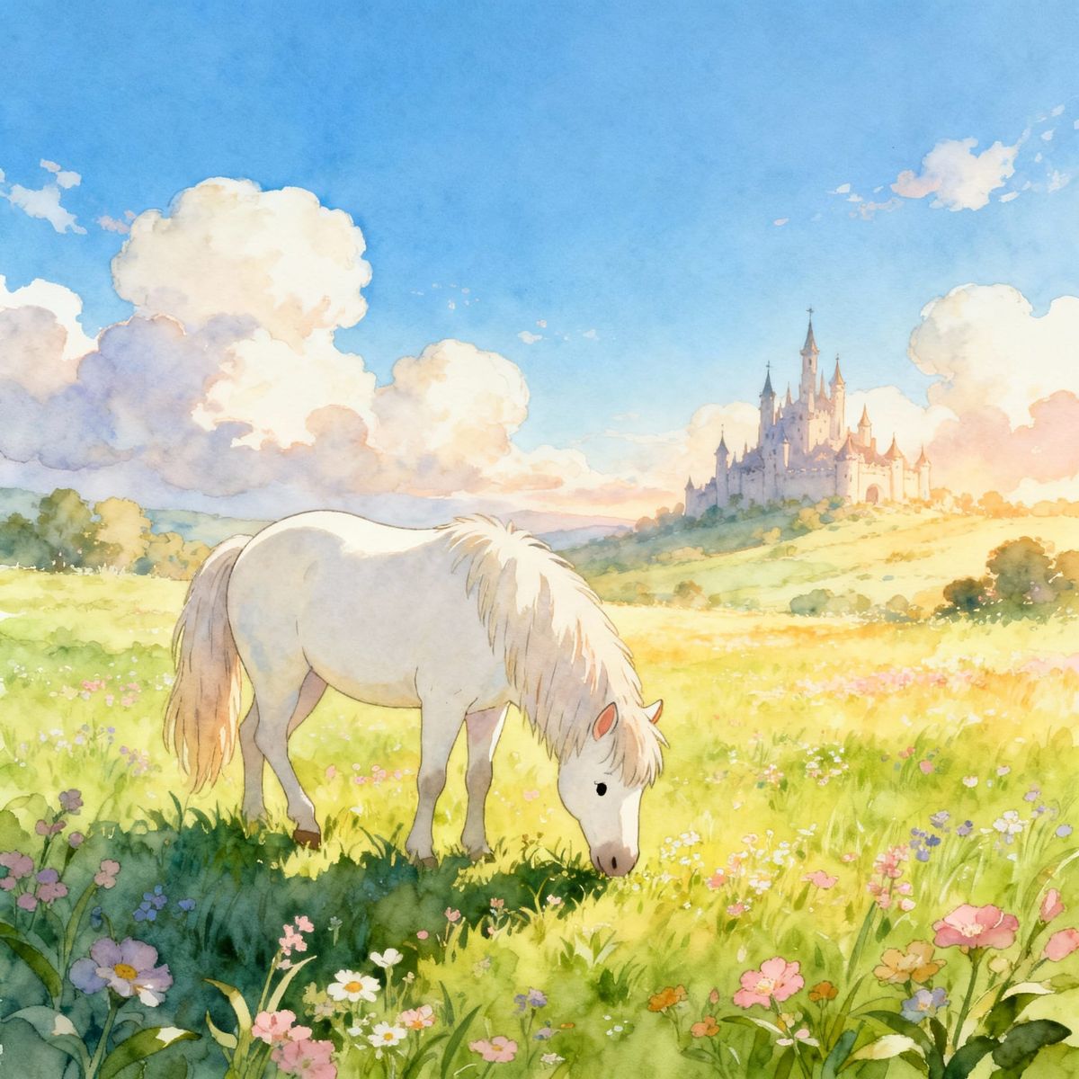This image shows a white pony in a lush spring meadow filled with pastel flowers, under a sky with soft clouds. A fairy-tale castle is visible in the distance, all rendered in a dreamy storybook illustration style.