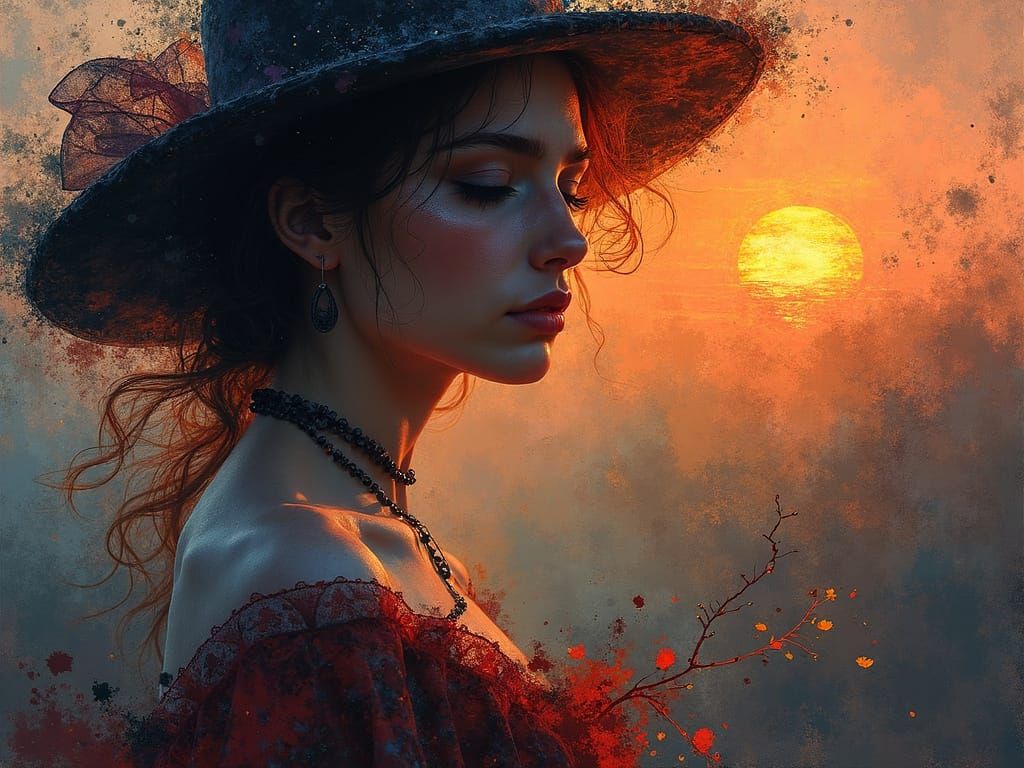 A striking image of a flamenco dancer's face bathed in sunset colors. The digital painting evokes a surreal and impressionistic atmosphere with jewel tones.