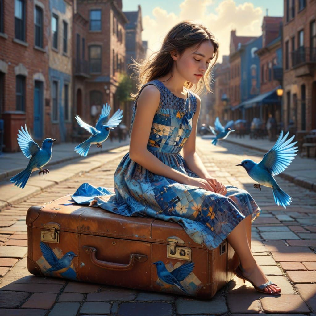 This image shows a girl in a patchwork dress sitting on a vintage suitcase. The artwork features hyperrealistic textures, a soft pastel cityscape, and blue birds in a splash art style.